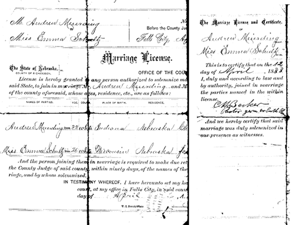 Children of ANDREW MEIERDING and EMMA SCHULTZ were: EDWARD HENRY MEIERDING , b. April 05, 1889, Falls City, Richardson, NE; d. April 08, 1967, Santa Cruz, Santa Cruz, CA (Source: Death Certificate & memory); m. (1)EDNA WALIZER, December 05, 1910, Beatrice, Gage, NE; m. (2) VIRGINIA MORROW, April 05, 1931, Plymouth, Marshall, IN. WALTER MEIERDING, b. September 17, 1890, Falls City, Richardson, NE (Source: SSDI); d. March 1970, Burrows, Carroll, IN). ELIZABETH MEIERDING, b. about 1893, Falls City, Richardson, NE; d. Aft. 1935, Grants Pass, OR (Source: Living in Grants Pass, OR in 1935 at time of her mother's death according to newspaper article.); m. (1) UNKNOWN MADISON; m. (2) UNKNOWN CLARK, Abt. 1913, Fall City, IA |