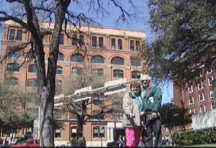 the Dallas Book Depository in the background